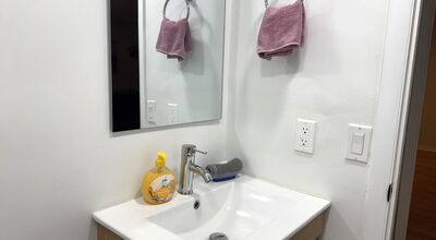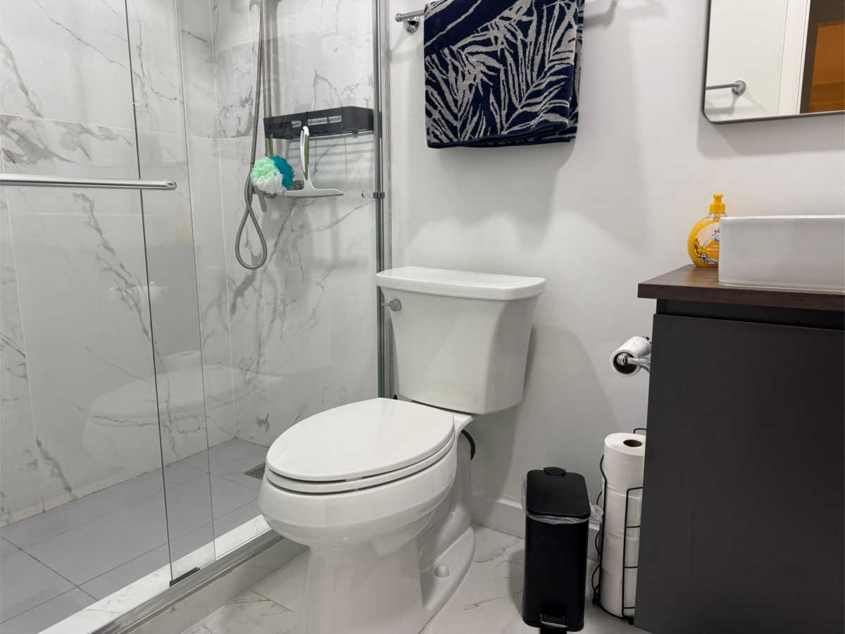 Master Bathroom: Marmor Regendusche, Toilette, Waschbecken, Schrank, Handtuchstangen, Hochwertige Einrichtung.