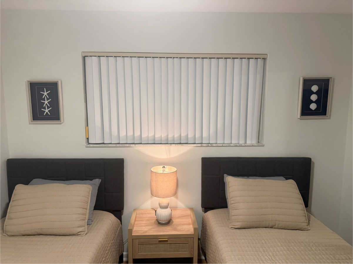 2x Einzelbett 90x180 cm, Begehbarer Kleiderschrank mit Schubladen, HD LED TV, Ventilator, Nachtisch mit Lampe.